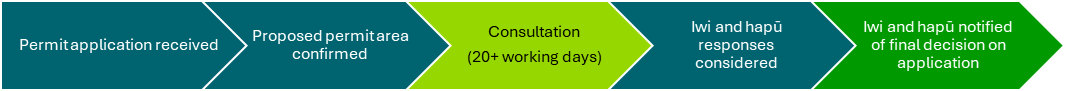 After we accept each application, we’ll then consult with all iwi and hapū whose rohe may be affected. This means you may be consulted on multiple applications, particularly if there are multiple competing applications for the same area.
