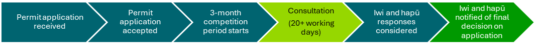 Once the competitive period has closed, and applications are ranked, we may consult again on the top-ranked application if there is a material change. This gives iwi and hapū an opportunity to provide any further feedback on the application most likely to be granted a permit.